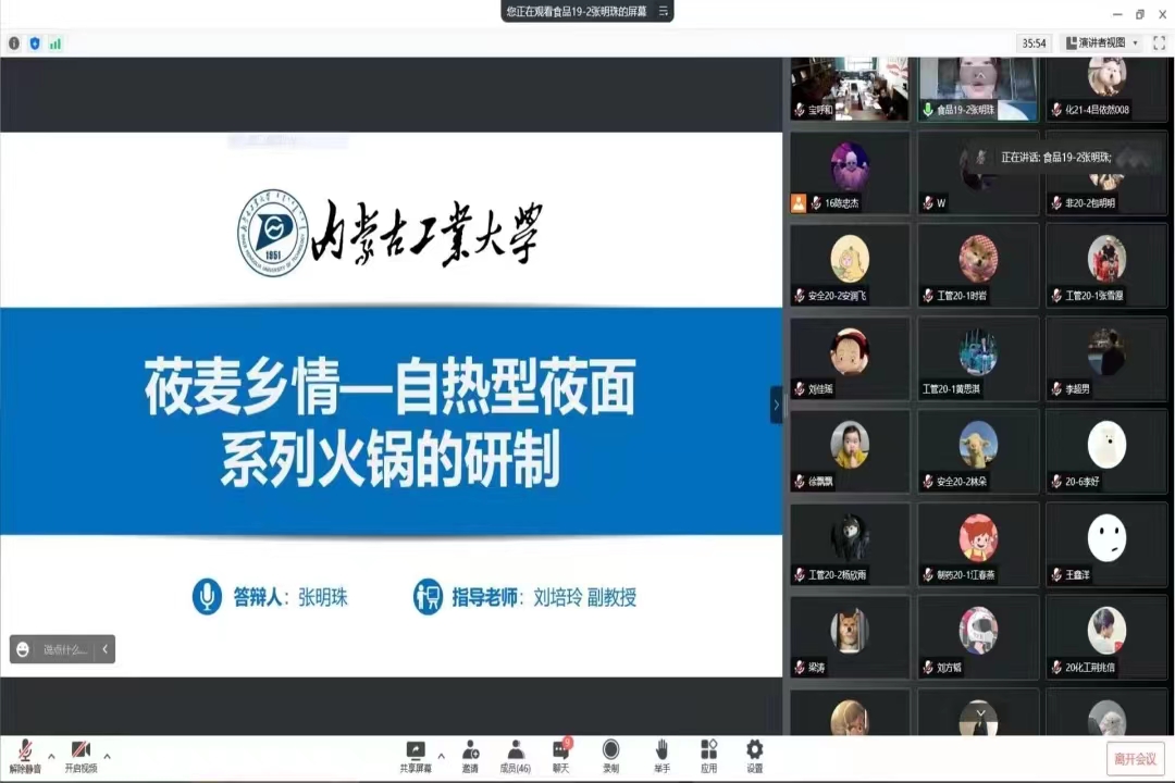 学生以线上腾讯会议的形式进行路演答辩,经过学院专家组初审共有六组项目成功进入路演答辩环节。经过激烈的角逐和专家组的认真研讨,最终确定来自食品科学与工程19级2班的张明珠同学的《自热型莜面系列火锅的研制》项目以及来自安全工程专业20级1班的王紫怡同学的《“废”起乌金——水处理“人工”新思路》项目将代表学院继续参加校赛。