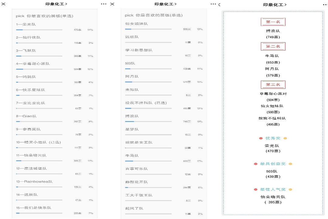 学院将参赛作品通过“印象化工”公众号线上推送、制作成展板等形式展出。经师生过线上投票、线下评选,最终,由分别来自食品19—1、化19—3、应化19—3三个班级的同学组成的搏浪队以749票荣获第一,他们的作品寓意着永远铭记历史,缅怀先烈,不忘国耻,奋勇向前;由化20—1组成的503队获最具创意奖,他们的作品体现了中华民族火热的民族精神 ;由制药20—2的同学组成的怡朵晓云队获最佳人气奖。