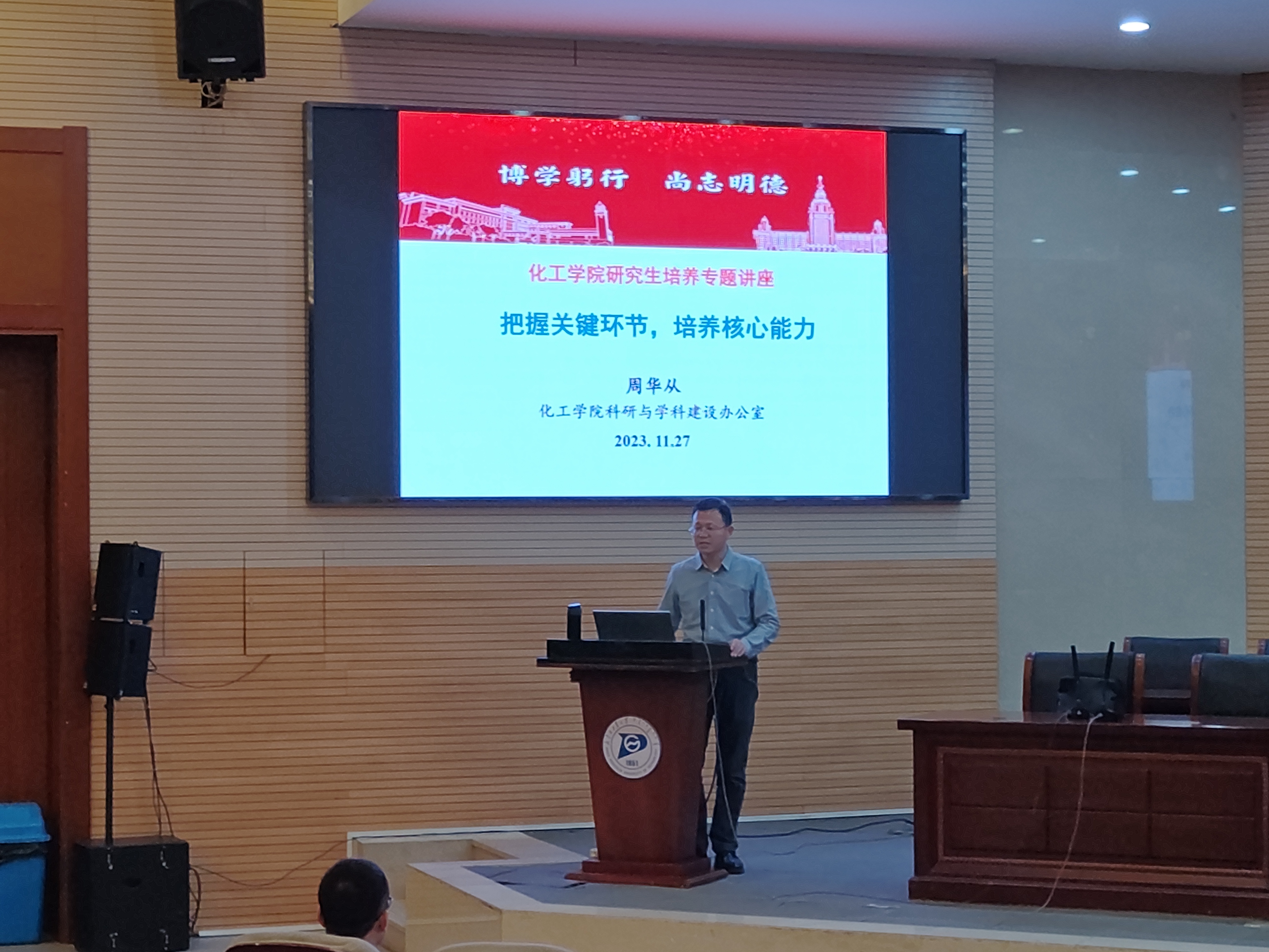 为进一步做好研究生开题、中期报告以及2024届毕业生毕业论文撰写指导服务工作,学院于1127日晚在化工楼报告厅举办研究生培养专题讲座,科研与学科办公室主任周华从教授为全院研究生做了主题为“把握关键环节,培养核心能力”的专题报告。