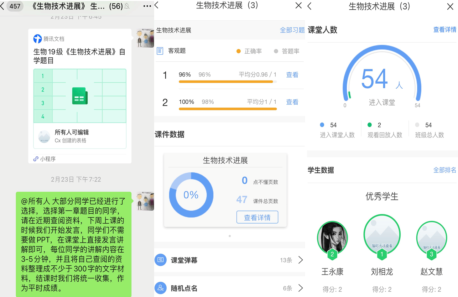 (1)利用“雨课堂”的“弹幕”、“随机点名”、“答题”功能,增加与学生的互动,也可随时了解学生在线与学习情况。