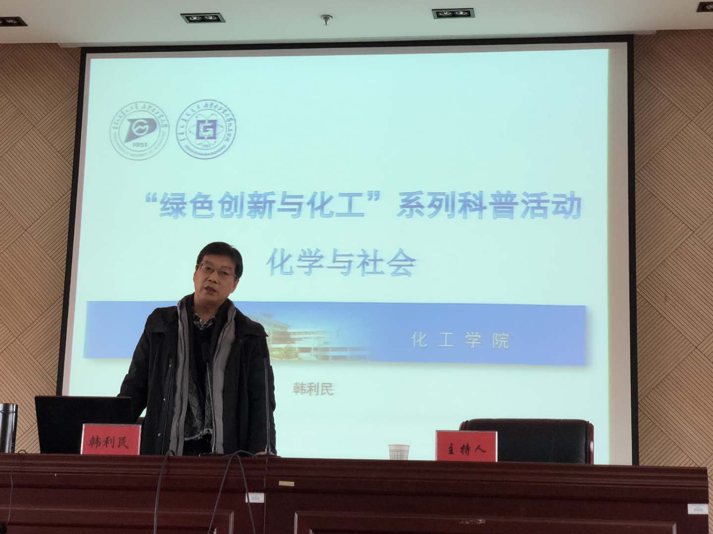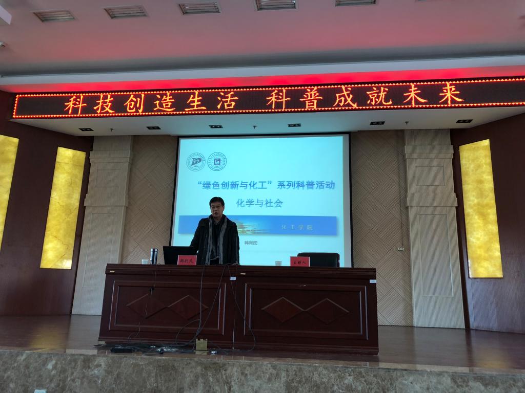 由内蒙古自治区科学技术协会主办,内蒙古自治区化工学会与yl6809永利集团联合承办的“绿色、创新与化工”系列科普活动校园行活动第四讲--《化学与社会》专题报告会于12月28日下午4:00在金川电力大楼10楼报告厅举行。讲座由人文学院副书记,副院长毛长明老师主持,韩利民教授主讲,金川校区二百余名同学参加本次科普讲座。