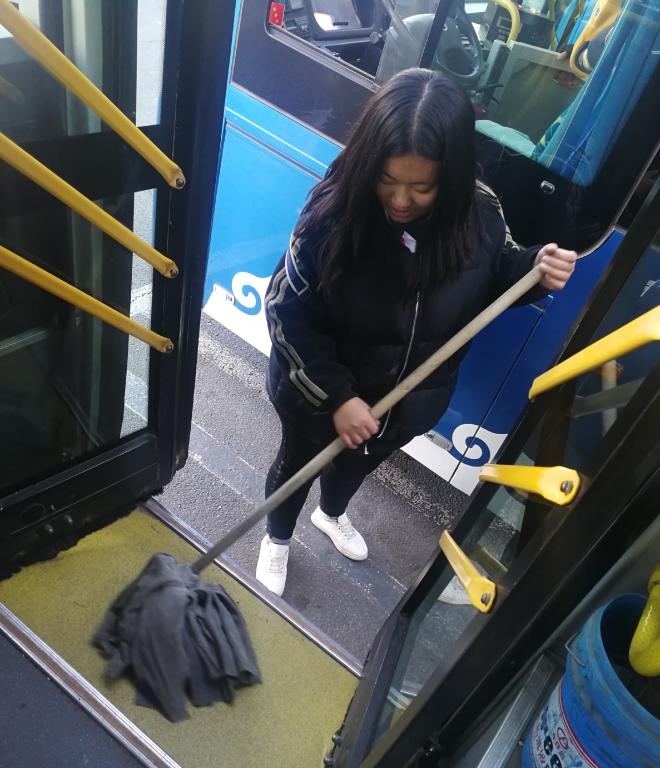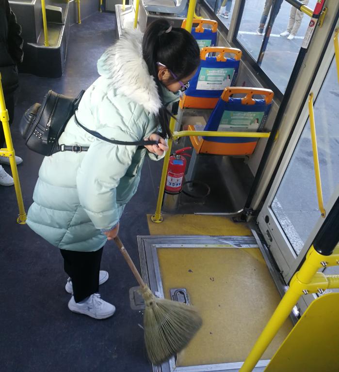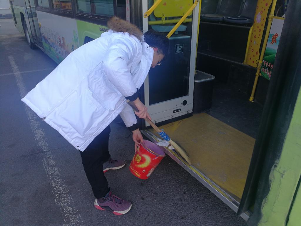 冬日的寒冷也未能阻挡志愿者们的服务热情,长期未打扫的公交车内积满了灰尘污垢,志愿者们不惧寒风,不怕脏累,抱着积极的态度进行工作。他们身着yl6809永利集团志愿者服,激情满满的投入志愿活动中,利用各种工具认真仔细地擦洗了公交车内的每个角落,没有一丝懈怠。志愿者们清扫完一辆公交车,立即赶往下一辆,四个小时的时间,将公交五公司内所有公交车都彻底清扫了一遍,并做好了善后工作。经过大家的共同努力,为青城市民打造出干净整洁的车内环境。