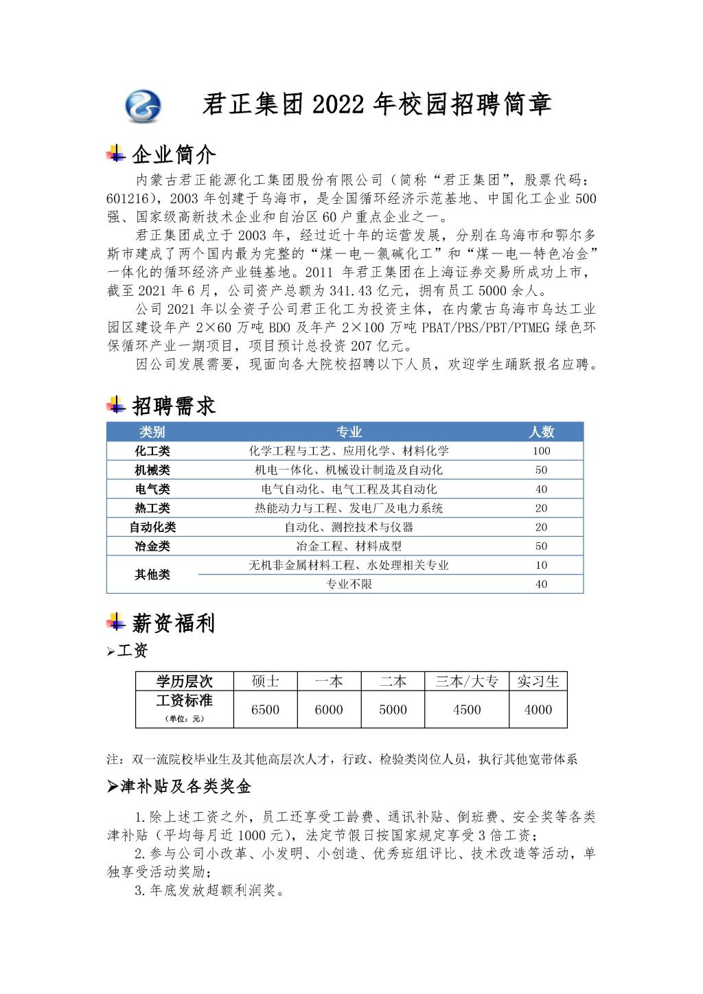 内蒙古君正能源化工集团股份有限公司2022年校园招聘简章