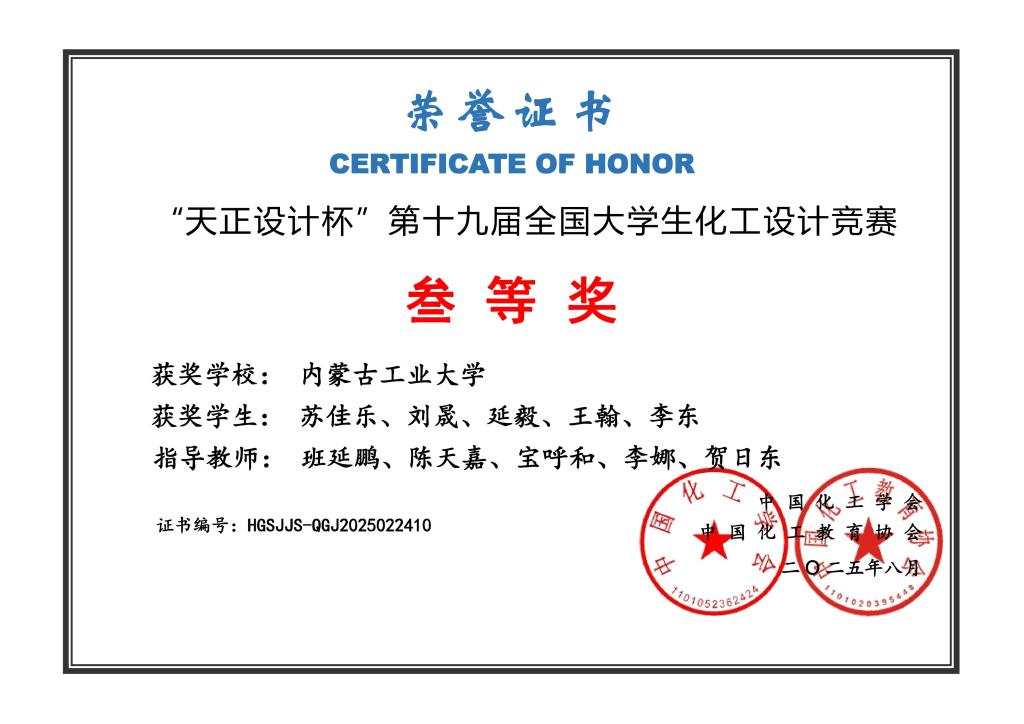 2025 年 8 月 17 日,第十九届全国大学生化工设计竞赛全国总决赛在天津大学圆满落幕。我院由王子阳、薛劲松、包鹏俊、朱思雨、邱晓洁同学组成的 “化成天下” 团队表现突出,成功摘得全国一等奖桂冠;此外,我院另有三支团队紧随其后、表现亮眼,分别斩获全国二等奖 1 项、三等奖 2 项。这是我院自参与该赛事以来,参赛队伍数量最多、获奖数量与等级均创历史新高的一届。