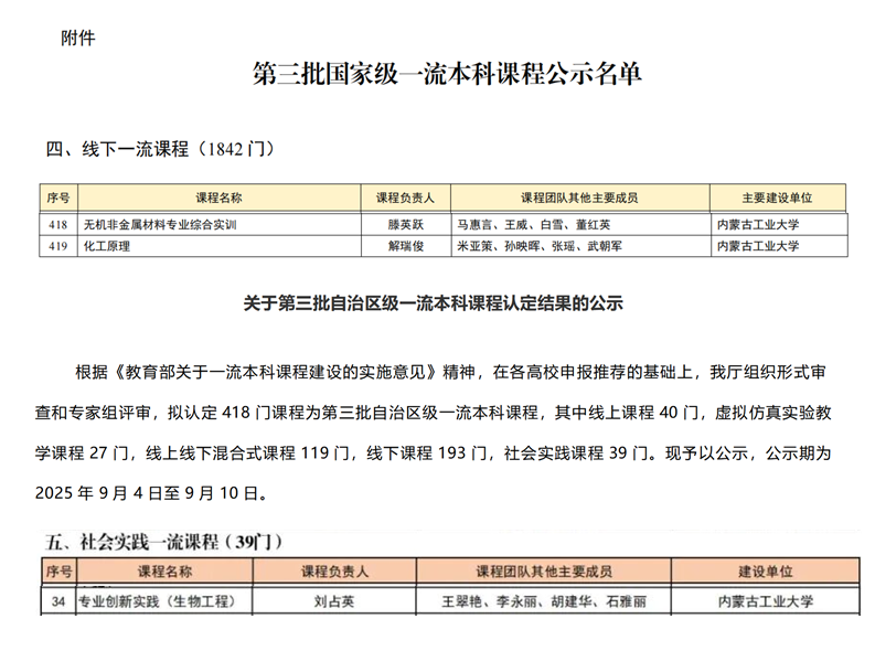 教育部及内蒙古自治区教育厅分别公示第三批国家级、自治区级一流本科课程认定名单,我院三门课程成功入选,标志着学院在教学建设方面取得重要进展。