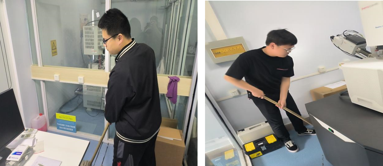 《现代分析测试技术》课程在分析测试中心开展了参观与观摩活动,为了保证本科生观摩前后实验室整洁、使用仪器的同学有良好的实验环境,组织学生对分析测试中心的地面、实验台和仪器设备表面进行清洁。