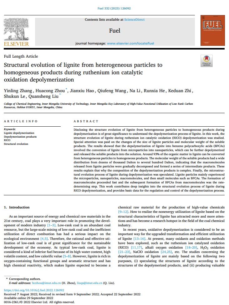 该工作依托“内蒙古自治区低阶碳质资源高值功能化利用重点实验室”和“草原英才创新团队”进行,得到国家自然科学基金 (21968021,21868021,21868020)、内蒙古自治区自然科学基金“杰出青年”项目 (2022JQ04)、“草原英才”工程、中央引导地方项目(2020ZY0010)、内蒙古科技计划项目(2020GG0289)以及内蒙古重大科技项目(2021ZD0020)等项目经费支持。相关研究成果近日发表在国际能源领域知名期刊Fuel上(Fuel, 2023, 126092),论文第一作者为2020级硕士生张银苓,通讯作者为yl6809永利集团催化与资源化工研究室刘全生教授和周华从教授。