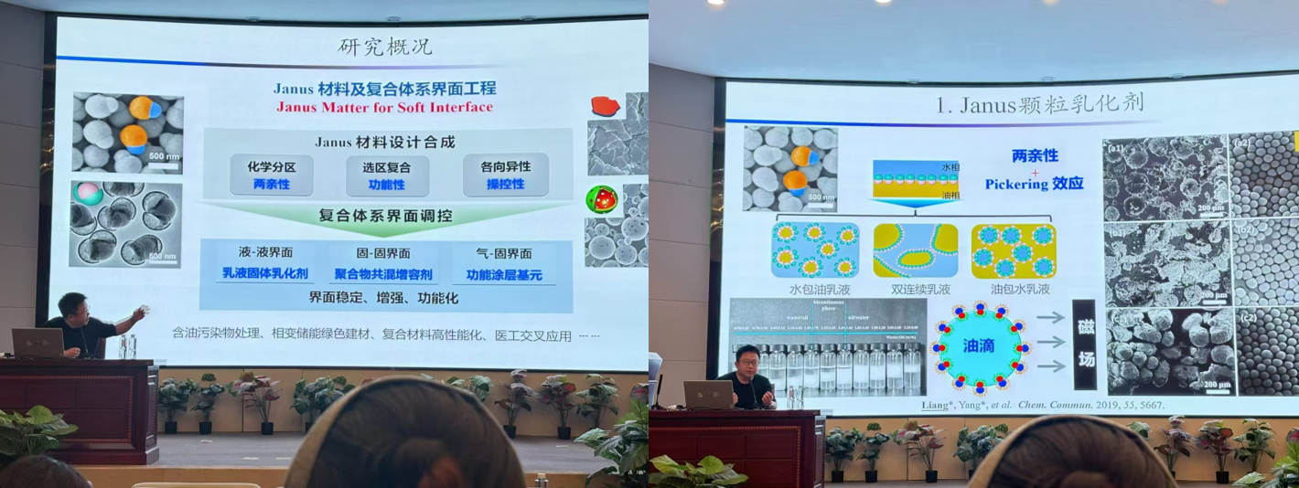报告围绕Janus材料化学组成和功能分区设计、宏观形态和微结构调控、材料批量化制备研究进展;探讨Janus材料在复合体系界面工程领域作为颗粒乳化剂、共混增容剂、功能涂层构筑单元等应用的探索及工程示范应用。通过交流,与会师生对Janus材料及复合体系的设计与应用有了更深刻的认识。