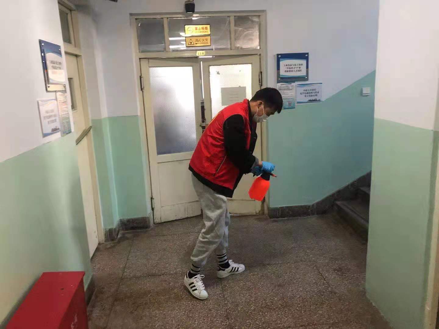 为加强落实疫情防控各项工作,在疫情防控中进一步发挥党支部战斗堡垒作用和党员先锋模范作用,yl6809永利集团研一研二学生党支部在认真配合好学校安排的疫情防控工作基础上,于2021年10月26日起,组织支部四十余名党员,分为十组,每日上午和下午为化学楼进行消毒,由于化学楼内进行的均是科研实验工作,部分实验室及设备对消杀工作有特色要求,出于安全考虑,每班负责消杀的学生党员均在相关教师的具体指导下,安全使用消毒工具开展消杀工作。