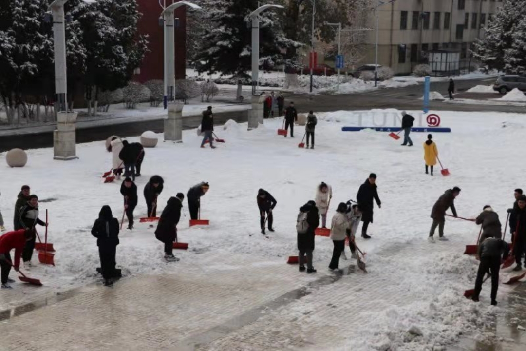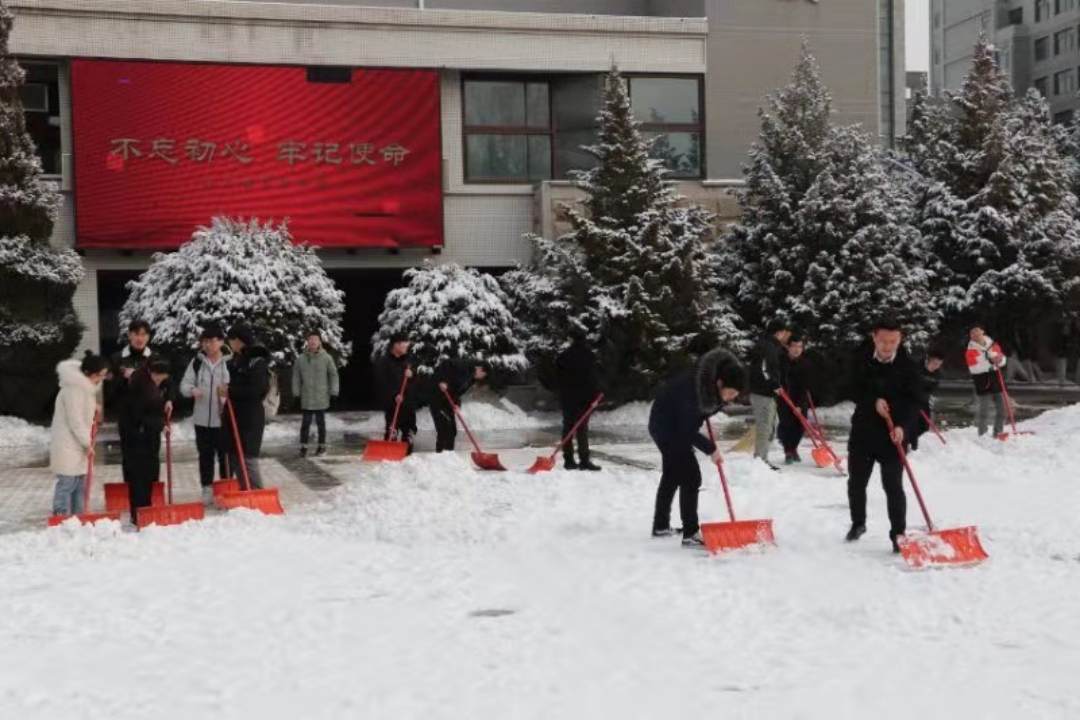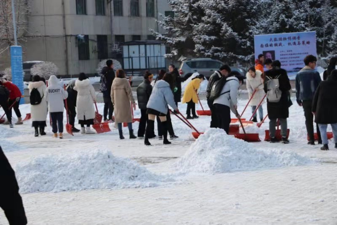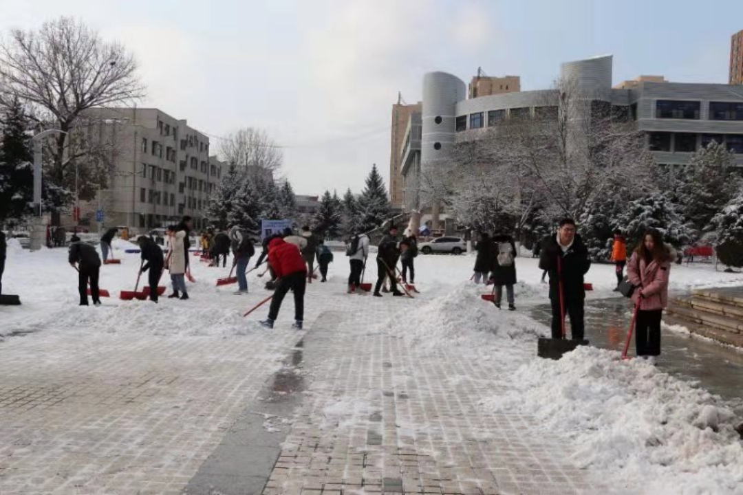 冬日寒风刺骨,大家的脸被风吹得通红、手脚被冻得麻木,但却依然斗志昂扬、干劲十足。大家互相帮助、默契配合,没有一丝的闲散,经过一个多小时的奋战,化工楼广场的积雪都被清扫干净,开辟了一条通畅之路。扫雪队伍成为冬日校园一道亮丽的风景线,同学们的热情似暖阳,让这个冬日变得格外温暖。