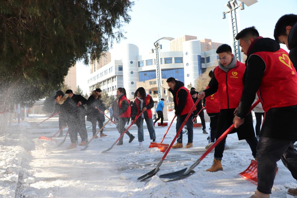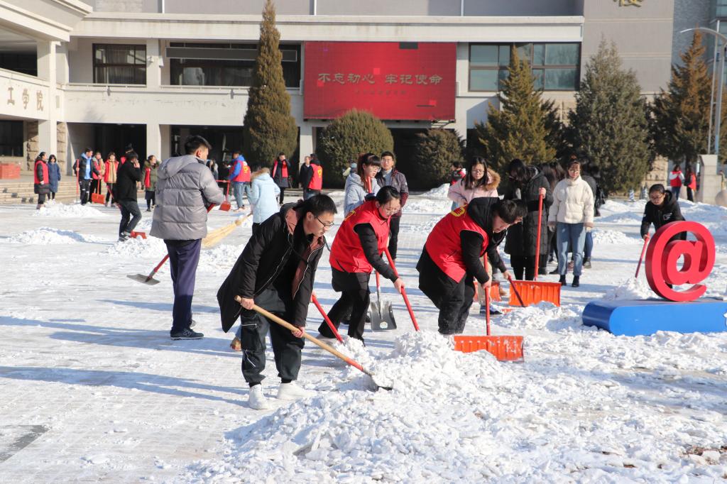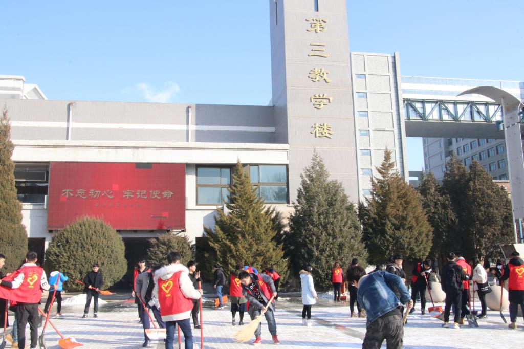老师、同学们手持铁锹、扫把等劳动工具积极投身扫雪行动。虽在零度以下的恶劣环境下扫雪除冰,但为师生的服务之心热情不减,干劲十足。部分同学边铲雪边说:“能帮到大家,就觉得挺值的。”大家忙碌的身影形成了严寒冬日里一道靓丽的校园风景线。