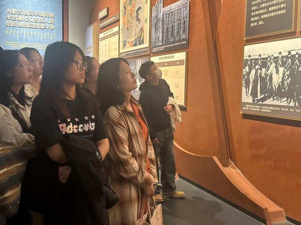 学生党员们在内蒙古博物院集体参观学习了1840年--1949年内蒙古各族人民在党的领导下争取解放的历程,逐步理清了新时代民族工作与青年党员责任的内在关联。在“大青山抗日根据地”的历史照片前,讲解员生动的讲述让大家更深刻地体会到蒙汉团结抗战的深厚情谊。